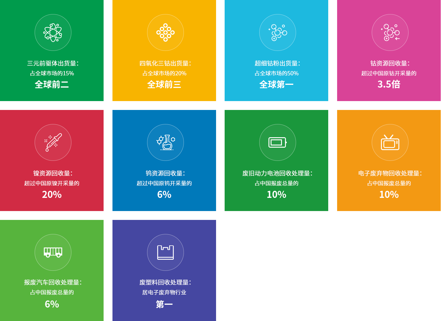 公司在中國(guó)11省市以及在南非、韓國(guó)、印尼等地建設(shè)了16個(gè)廢物循環(huán)處理工廠與新能源材料制造工廠,構(gòu)建以中國(guó)主要城市為中心的城市礦山回收開(kāi)采體系,綠色發(fā)展的足跡輻射世界、覆蓋中國(guó)40%以上國(guó)土面積,與超過(guò)5億人口建立廢物處理合作關(guān)系,循環(huán)再造鈷、鎳、鋰、銅、鎢、金、銀、鉑、鈀、銠、鎵、鍺、銦、稀土等30余種稀缺資源,年回收處理退役動(dòng)力電池與電子廢棄物占中國(guó)總量的10%以上,年回收處理的報(bào)廢汽車占中國(guó)報(bào)廢總量的6%以上,年回收的鎳資源占中國(guó)原鎳開(kāi)采量的20%以上,回收利用的鈷資源超過(guò)中國(guó)原鈷開(kāi)采量的350%以上,回收的鎢資源占中國(guó)原鎢開(kāi)采量的10%以上。