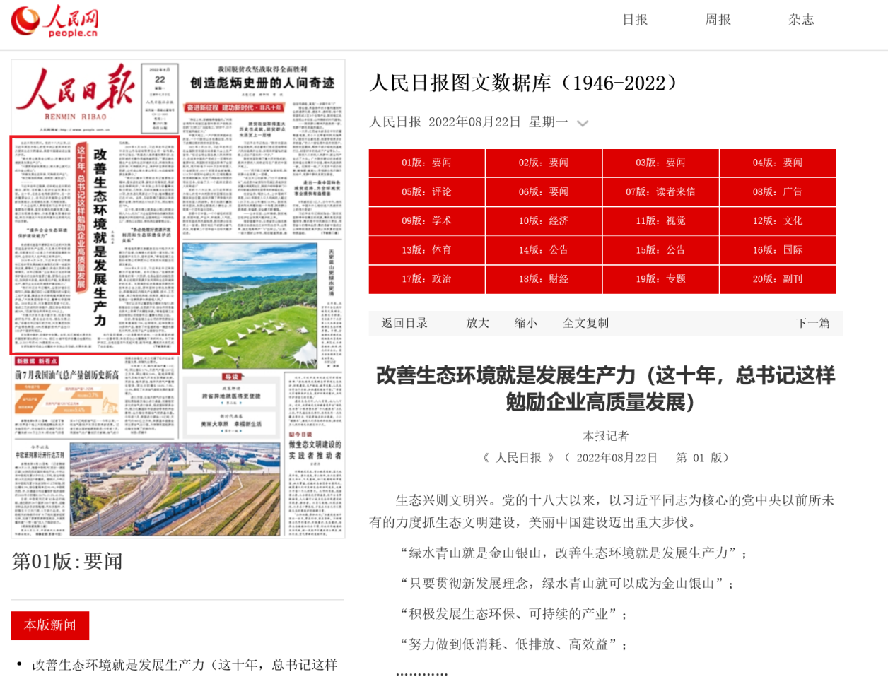 2022年8月22日,《人民日?qǐng)?bào)》頭版頭條刊發(fā)報(bào)道《改善生態(tài)環(huán)境就是發(fā)展生產(chǎn)力(這十年,總書(shū)記這樣勉勵(lì)企業(yè)高質(zhì)量發(fā)展)》,肯定了企業(yè)在貫徹新發(fā)展理念,實(shí)現(xiàn)綠色發(fā)展、可持續(xù)發(fā)展方面作出的重要貢獻(xiàn)。其中,格林美作為中國(guó)生態(tài)環(huán)境保護(hù)事業(yè)和中國(guó)綠色低碳循環(huán)經(jīng)濟(jì)高質(zhì)量發(fā)展的典型代表,再獲《人民日?qǐng)?bào)》點(diǎn)贊,這是今年以來(lái)《人民日?qǐng)?bào)》第二次在頭版頭條專題報(bào)道中點(diǎn)贊格林美。文中提到(以下內(nèi)容摘自《人民日?qǐng)?bào)》):