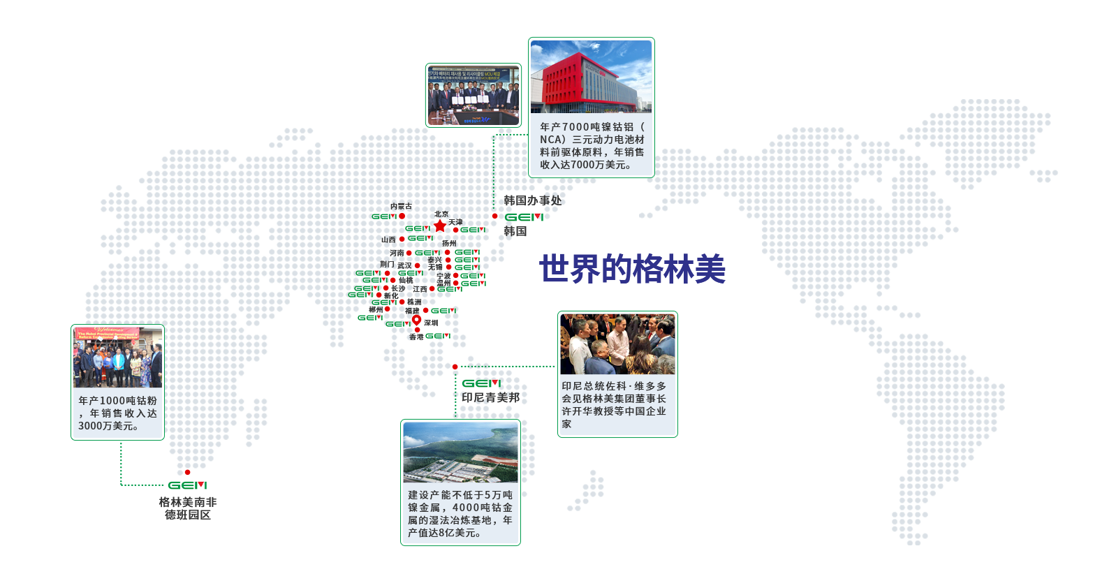 作為中國(guó)開(kāi)采城市礦山與新能源材料的綠色領(lǐng)軍企業(yè),格林美從攻克廢舊電池回收技術(shù)開(kāi)始,再到攻克電子廢棄物綠色處理、報(bào)廢汽車(chē)整體資源化回收技術(shù)以及動(dòng)力電池材料的三元“核”技術(shù)等世界技術(shù)難題,突破性解決了中國(guó)在廢舊電池、電子廢棄物與報(bào)廢汽車(chē)等典型廢棄資源綠色處理與循環(huán)利用的關(guān)鍵技術(shù)難點(diǎn)。公司在湖北、湖南、廣東、江西、河南、天津、江蘇、浙江、山西、內(nèi)蒙古、福建等十一省和直轄市建成16個(gè)循環(huán)經(jīng)濟(jì)與新能源材料園區(qū),綠色循環(huán)發(fā)展的足跡覆蓋中國(guó)、縱橫3000公里,與中國(guó)近5億人建立了循環(huán)經(jīng)濟(jì)合作關(guān)系。公司在南非、韓國(guó)、印尼、歐洲布局,綠色技術(shù)輻射世界。