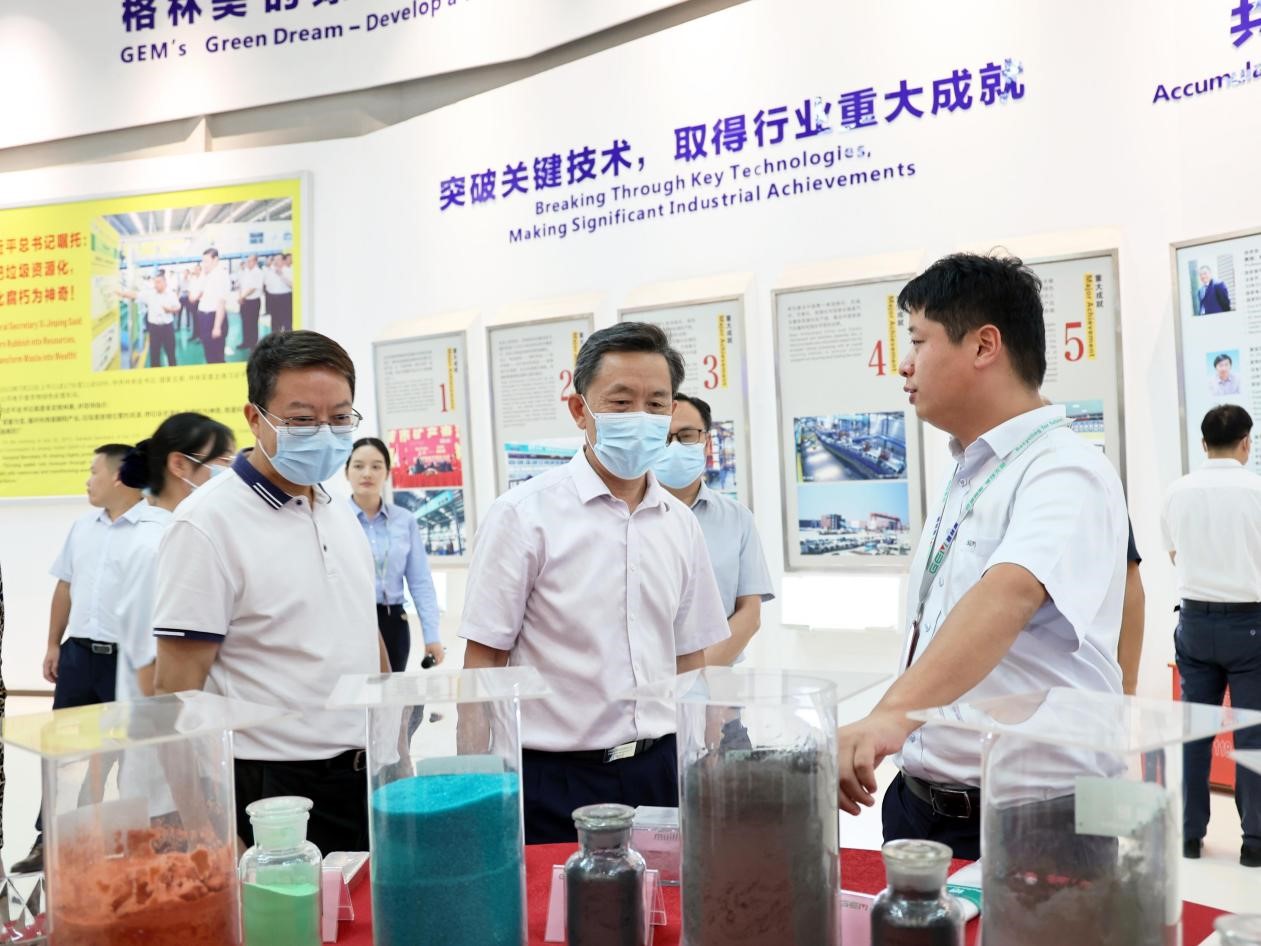 在退役動力電池包的梯級利用展示墻前,郭躍進副主席駐足觀看,并不時提問,表現(xiàn)出濃厚興趣。對郭躍進副主席等領(lǐng)導(dǎo)一行提出的問題,格林美陪同人員進行了一一解答。對于剩余容量70%及以上的電池會進入梯次利用,用在一些不需要高性能的場合;剩余容量不足70%的退役動力電池,將剩余能量回饋到電網(wǎng)后,將進行破碎、熱解,通過提純后成為硫酸鎳、硫酸錳、硫酸鈷等,作為生產(chǎn)新能源電池的原材料。從退役動力電池中而來,又再次回到新能源電池中,實現(xiàn)從“綠色”到“綠色”的產(chǎn)業(yè)循環(huán)。