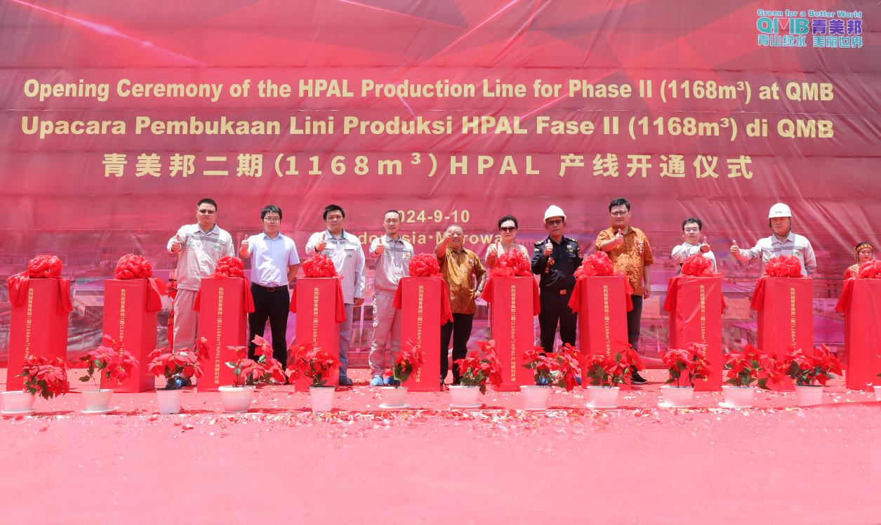 2024年9月10日上午,格林美印尼青美邦鎳資源二期濕法冶煉(1,168m3反應(yīng)器)(HPAL)產(chǎn)線開通儀式在青美邦園區(qū)隆重舉行。青美邦股東代表、永青集團(tuán)副總裁章凡先生,IMIP運(yùn)營副總監(jiān)蘇德森先生,印尼政府莫羅瓦利海關(guān)代表Junaedi先生,格林美集團(tuán)董事長許開華教授,格林美集團(tuán)聯(lián)合實(shí)控人、董事王敏女士,青美邦股東代表韓國EcoPro本部長李升煥先生、日本阪和專務(wù)KURATA先生以及IMIP園區(qū)企業(yè)代表、青美邦建設(shè)合作伙伴代表等共300余人出席本次儀式。
