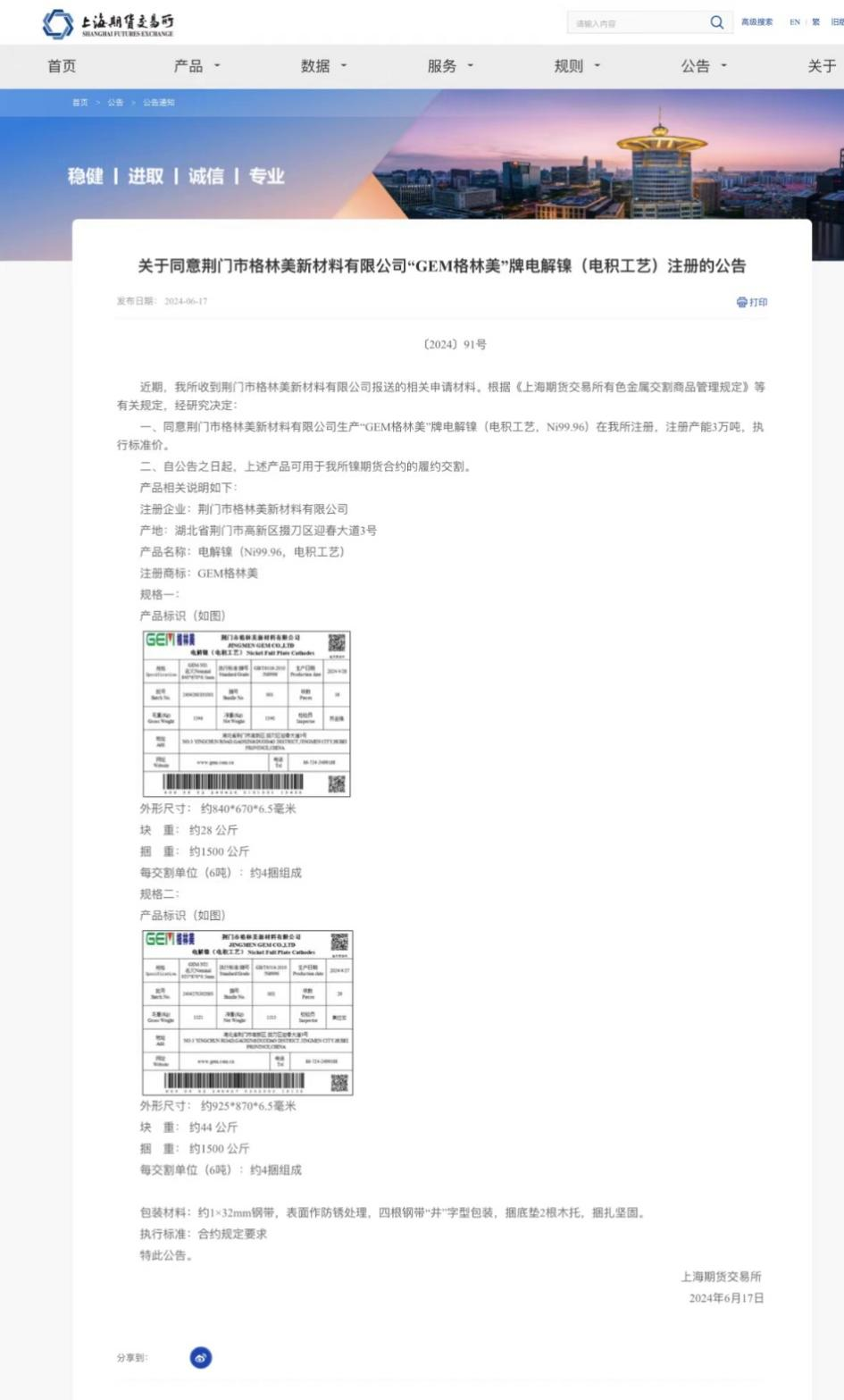 2024年6月17日,格林美集團(tuán)子公司荊門市格林美新材料有限公司生產(chǎn)的“GEM格林美”牌電解鎳(電積工藝,Ni99.96)成功在上海期貨交易所完成注冊,注冊產(chǎn)能為3萬噸。這是繼2023年11月,格林美電解鎳品牌GEM-NI1、GEM-NI2成功注...