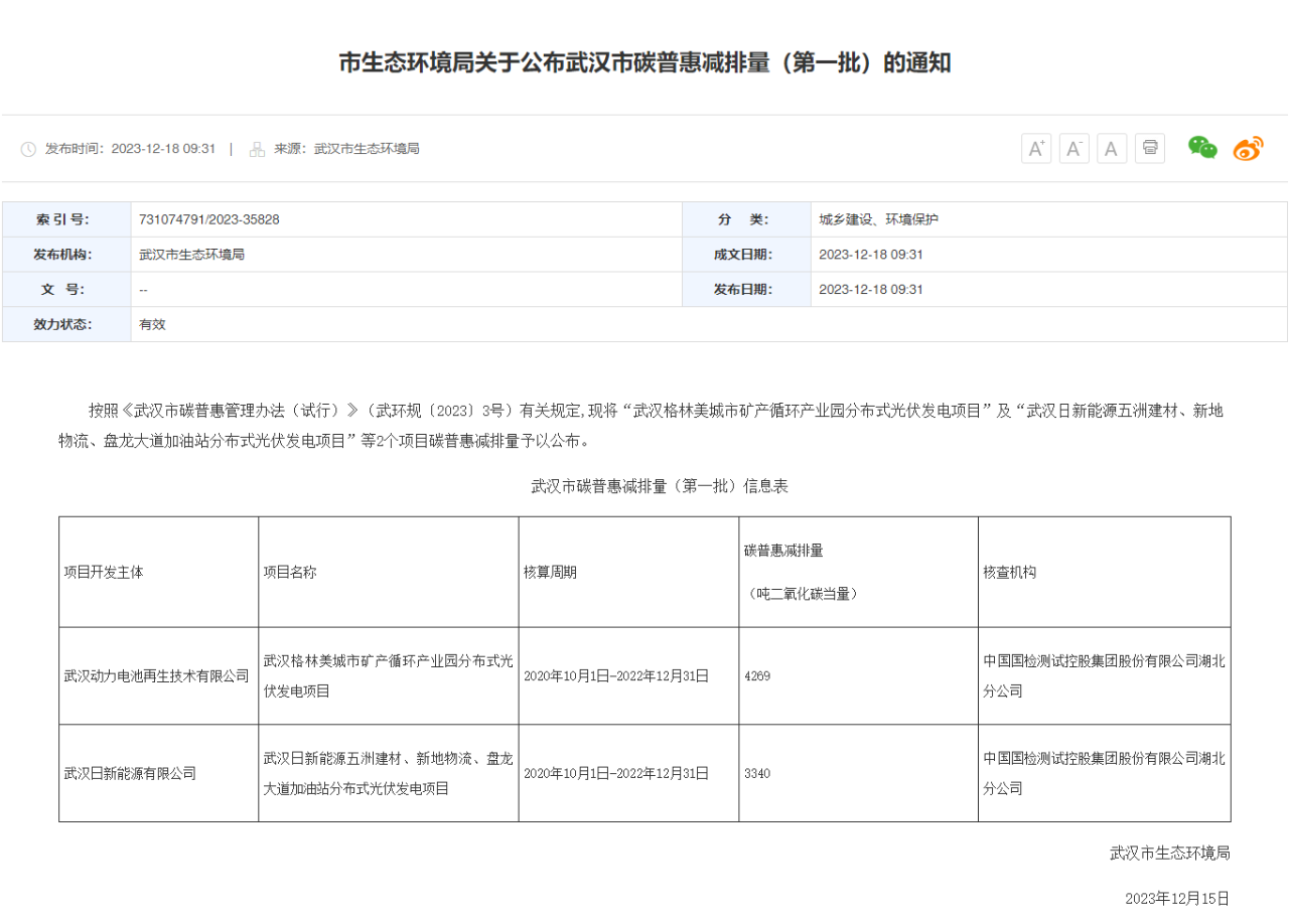 2023年12月18日,武漢碳普惠登記平臺登記了經(jīng)武漢市生態(tài)環(huán)境局發(fā)布的首批(僅有2家單位)碳普惠減排量項(xiàng)目,共計(jì)減排7609噸,其中格林美集團(tuán)申報(bào)的“武漢格林美城市礦產(chǎn)循環(huán)產(chǎn)業(yè)園分布式光伏發(fā)電項(xiàng)目”獲批簽發(fā)登記碳普惠...
