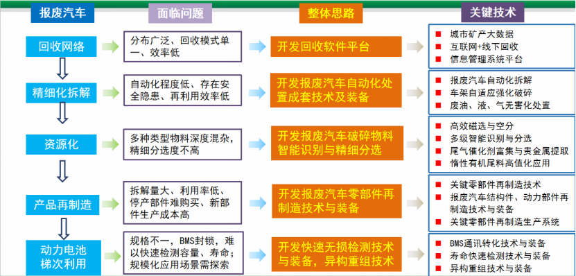 報廢汽車精細化拆解主要可以由預處理、拆解、破碎三個步驟組成。格林美在遵循行業(yè)基本規(guī)范的同時形成了如下圖所示的研發(fā)思路。