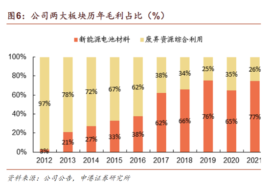 從數據來看,疫情之下,公司營收和凈利潤飛速增長,新能源相關業(yè)務貢獻了大半壁江山。2021年,公司新能源電池材料業(yè)務實現(xiàn)營業(yè)收入137.30億元,同比增長106.13%,占全年營收超七成,并貢獻了77%的毛利潤,新能源材料板塊業(yè)務已成為公司的絕對核心業(yè)務。