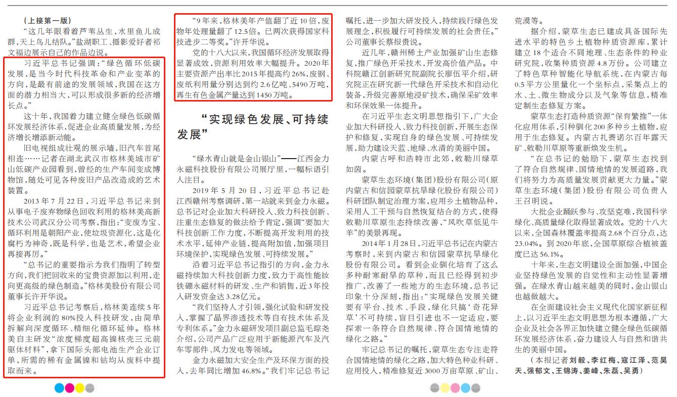 8月22日,《人民日報》頭版頭條刊發(fā)報道《改善生態(tài)環(huán)境就是發(fā)展生產(chǎn)力(這十年,總書記這樣勉勵企業(yè)高質(zhì)量發(fā)展)》,肯定了企業(yè)在貫徹新發(fā)展理念,實現(xiàn)綠色發(fā)展、可持續(xù)發(fā)展方面作出的重要貢獻。其中,格林美作為中國生態(tài)環(huán)境保護事業(yè)和中國綠色低碳循環(huán)經(jīng)濟高質(zhì)量發(fā)展的典型代表,再獲《人民日報》點贊,這是今年以來《人民日報》第二次在頭版頭條專題報道中點贊格林美。文中提到: