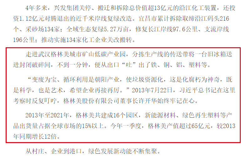 6月13日,人民日報《奮力譜寫新時代高質(zhì)量發(fā)展新篇章(沿著總書記的足跡·湖北篇)》登載了格林美的綠色循環(huán)產(chǎn)業(yè)成就。