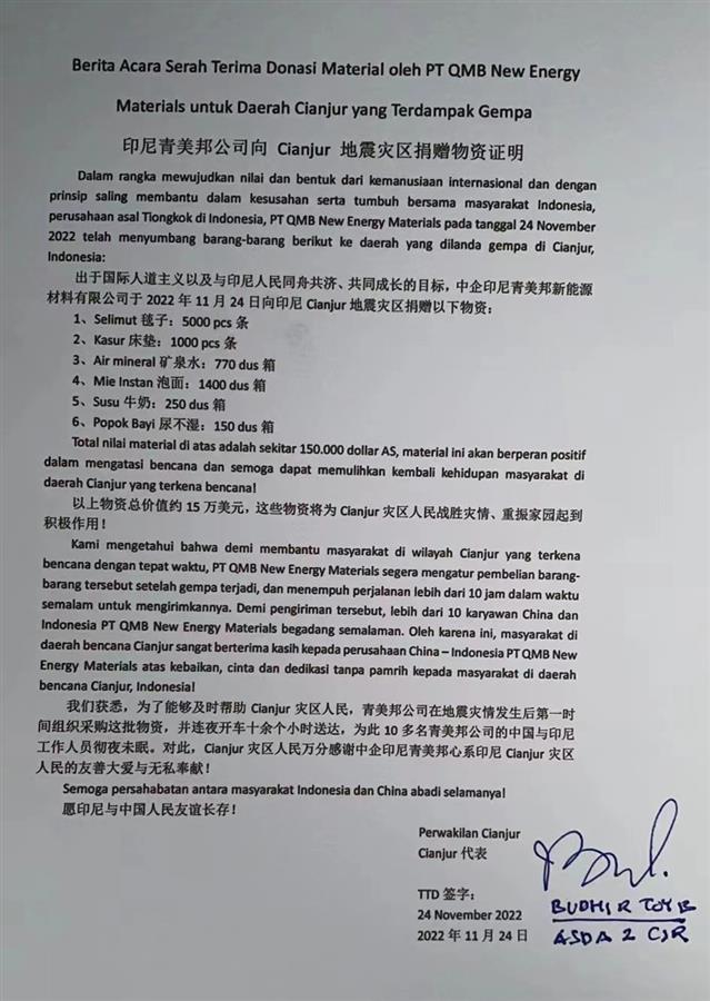 展玉災(zāi)區(qū)政府十分感謝中國(guó)企業(yè)青美邦的友善大愛(ài)與無(wú)私奉獻(xiàn),認(rèn)為這高度體現(xiàn)了印尼與中國(guó)人民之間的深厚友誼!
