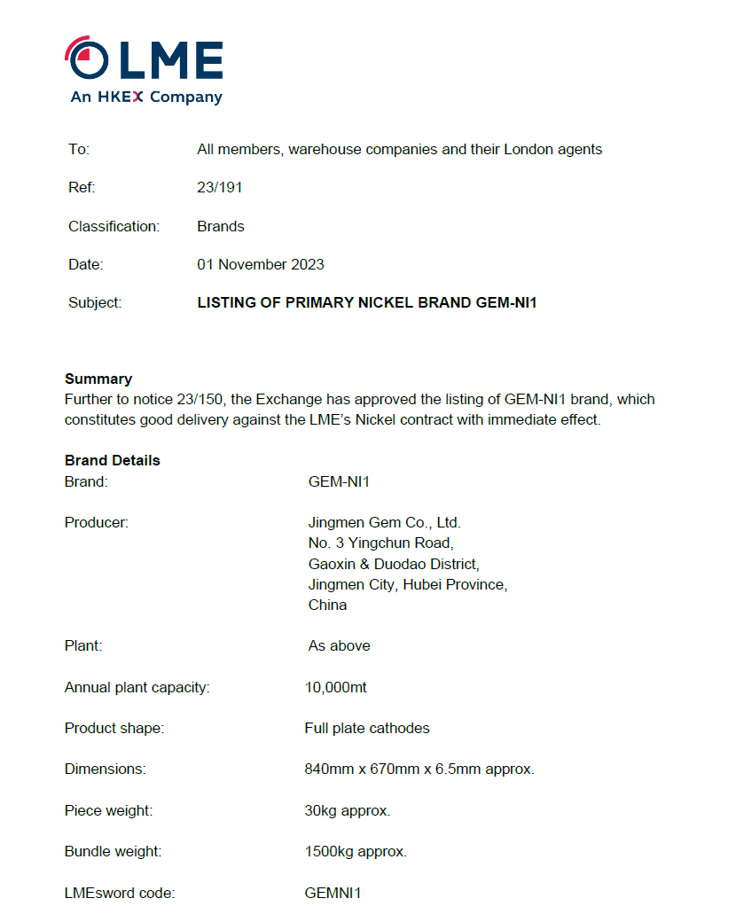 2023年11月1日,‘GEM-NI1' 牌電解鎳成功注冊倫敦金屬交易所交割品牌,JINGMEN GEM CO., LTD 成為LME鎳品牌注冊快速通道推出后的第二家受益的公司。