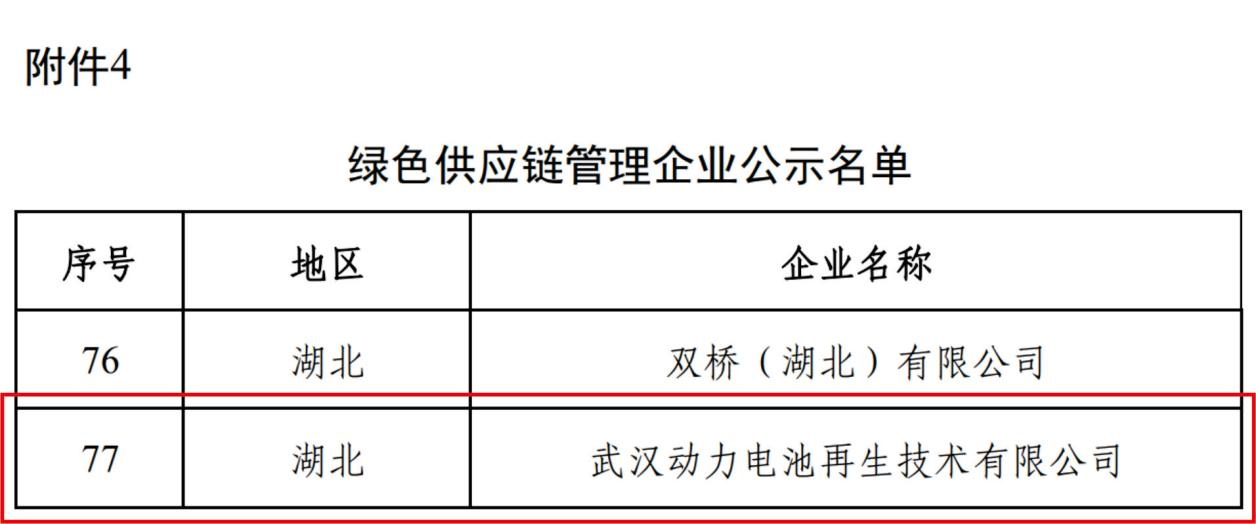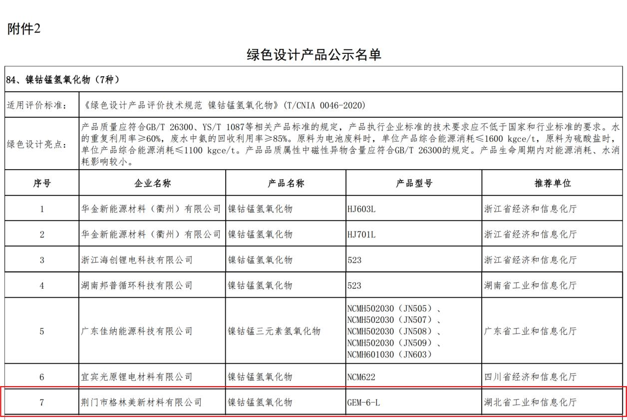 2023年2月9日,國(guó)家工信部發(fā)布了關(guān)于“2022年度綠色制造名單公示”的通知,荊門市格林美新材料有限公司鎳鈷錳氫氧化物GEM-6-L成功入選“2022年度綠色設(shè)計(jì)產(chǎn)品”,武漢動(dòng)力電池再生技術(shù)有限公司入選“2022年度綠色供應(yīng)鏈管理企業(yè)”。