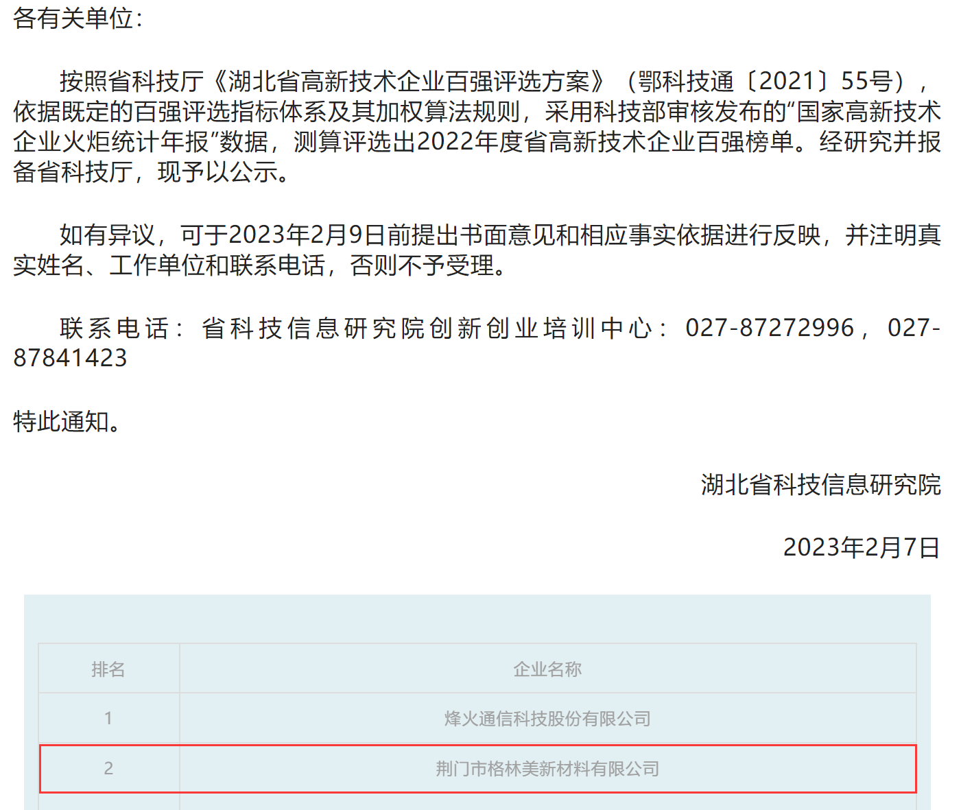 2月7日,湖北省科技信息研究院公布了2022年度省高新技術(shù)企業(yè)百?gòu)?qiáng)榜單,荊門市格林美新材料有限公司位列第二。