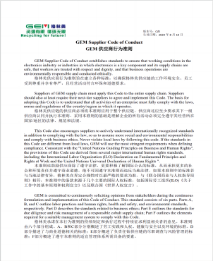 為踐行自身以及供應(yīng)鏈的可持續(xù)發(fā)展道路,格林美提倡與供應(yīng)商建立長(zhǎng)期穩(wěn)定的誠(chéng)信合作關(guān)系,鼓勵(lì)供應(yīng)商履行社會(huì)責(zé)任,共同推進(jìn)負(fù)責(zé)任供應(yīng)鏈的建設(shè)。格林美參考 OECD 指南、中國(guó)指南和工商業(yè)與人權(quán)制定了格林美《關(guān)于負(fù)責(zé)任采購(gòu)的供應(yīng)商標(biāo)準(zhǔn)》、《GEM 供應(yīng)商行為準(zhǔn)則》、《格林美負(fù)責(zé)任全球供應(yīng)鏈的盡責(zé)管理政策》,其中概述了勞工和人權(quán)、健康及安全、環(huán)境、道德等要求,并將這些條款運(yùn)用到格林美供應(yīng)商的評(píng)估和準(zhǔn)入中,我們將積極地監(jiān)管供應(yīng)商的合規(guī)性,任何違反標(biāo)準(zhǔn)的行為可能會(huì)損害雙方關(guān)系,甚至導(dǎo)致終止雙方業(yè)務(wù)關(guān)系。